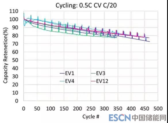 通過在電解液里添加提高SEI膜穩(wěn)定性的添加劑,提高了電芯的性能和壽命。2017年,篩選了100多種電解液配方,包括不同添加劑、溶劑和鋰鹽。重點改善正極在高SOC和高溫下的產(chǎn)氣。通過測試高溫(50℃)下的循環(huán)和存儲性能來篩選電解液。循環(huán)測試制度為:CC-CV at C/2 rate with 10% current taper and C/2discharge rate, over the full voltage range (2.85-4.25V)。