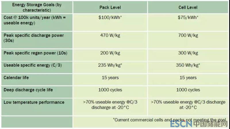 其車用電池研發(fā)項目(Battery Program)的目標(biāo)之一是研發(fā)純電動汽車用高能量密度的電池。單體電芯的比能量大于350Wh/kg,循環(huán)壽命大于1000次。項目資助了Envia systems、LGCPI、24M、Farasis Energy、Amprius和SiNode Systems 6家公司研究電芯。其中24M主要研究半固態(tài)鋰離子電芯,SiNode Systems重點研究克容量大于1000Wh/kg的硅/石墨烯復(fù)合材料,其余4家公司研究硅負(fù)極鋰離子電芯。下圖是電池系統(tǒng)和電芯的目標(biāo)。