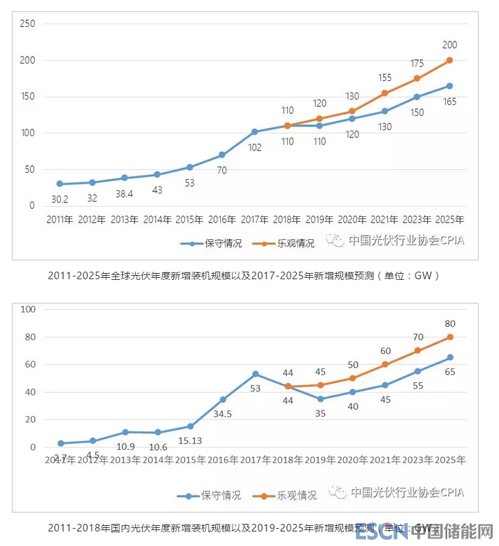 2018年,全球光伏新增裝機市場預(yù)計達到110GW,創(chuàng)歷史新高。2019年,在光伏發(fā)電成本持續(xù)下降和新興市場拉動等有利因素的推動下,全球光伏市場仍將保持增長,預(yù)計全年全球光伏新增裝機量將超過110GW,樂觀情形下甚至達到120GW。受政策影響,2018年國內(nèi)光伏新增裝機下滑至44GW,同比下降19%,但仍居全球首位,預(yù)計2019年仍將保持35-45GW的新增市場需求。