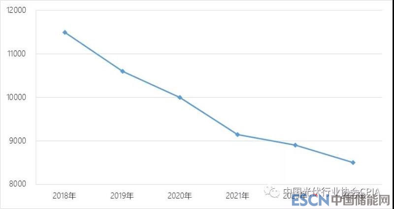 2018-2025年三氯氫硅法多晶硅生產(chǎn)線設(shè)備投資成本變化趨勢(單位:萬元/千噸)