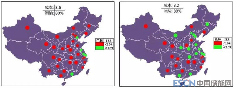 投資成本為3.2元/W時(shí),滿足收益率要求的有16個(gè)城市:蒙西、冀北、鄭州、濟(jì)寧、西安、北京、天津、長春、合肥、連云港、蘇州、上海、武漢、深圳、佛山、南寧。
