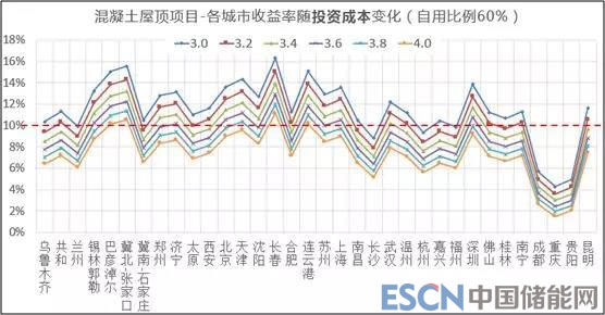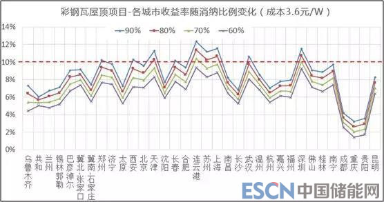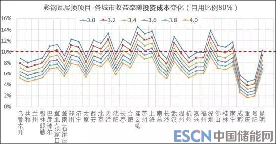 根據(jù)測算結(jié)果,對于彩鋼瓦屋面項(xiàng)目,初始投資成本為4.0元/W,以及消納比例在50%以下初始投資成本大于3.4元/W時(shí),幾乎沒有城市滿足收益率要求。