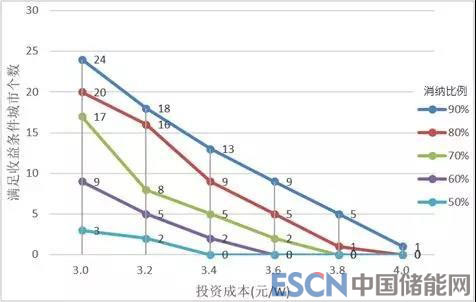混凝土屋面項(xiàng)目均采用當(dāng)?shù)刈罴褍A角,根據(jù)測算結(jié)果可得不同投資成本和消納比例下滿足收益要求的城市個(gè)數(shù),如下圖。當(dāng)初始投資成本小于3.6元、消納比例大于70%時(shí),有一半以上城市在無補(bǔ)貼條件下滿足收益率要求。