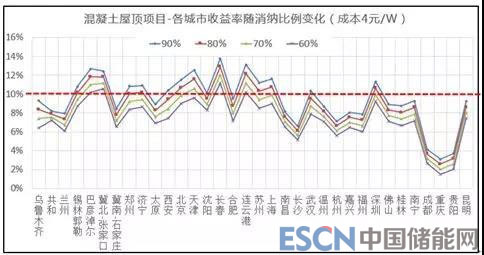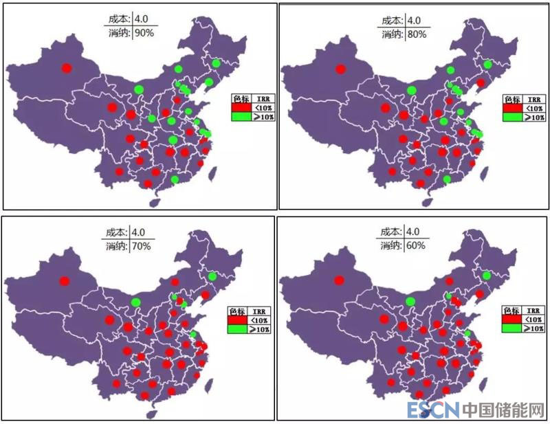 60%自用比例下有4個(gè)的城市(地區(qū))滿足收益率要求,蒙西、冀北、長春、連云港。