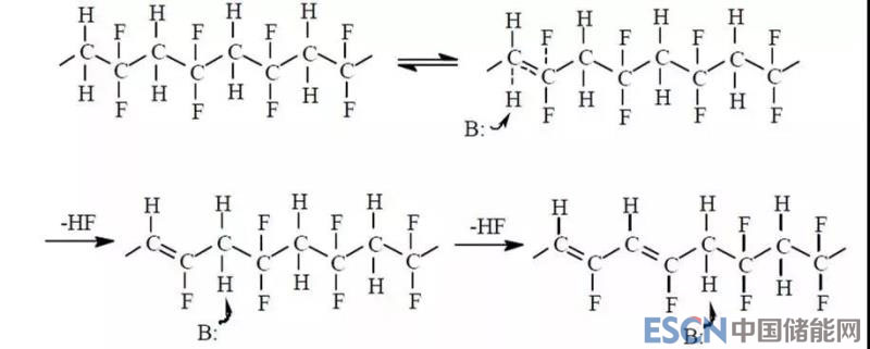 除了PVDF粉末的溶解外,對于NMP溶劑的水分要特別控制,NMP吸水程度要比正極活物質(zhì)、導電劑等材料吸水嚴重。NMP內(nèi)部游離氨的存在、吸水后漿料pH值升高,堿性基團會攻擊相鄰的C-F、C-H鍵,PVDF很容易發(fā)生雙分子消去反應,會在分子鏈上形成一部分的碳碳雙鍵: