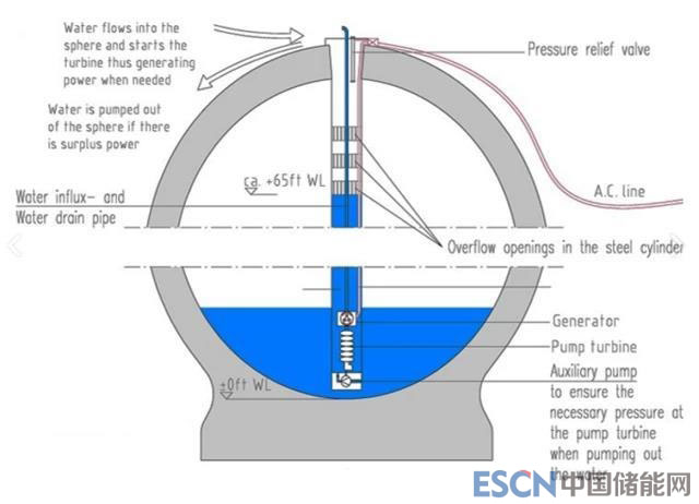 StEnSea項目為安裝在海底,可與海上風(fēng)電場聯(lián)接的大型儲能設(shè)施。其儲能原理類似于常規(guī)抽水儲能電站的物理原理,但其儲能主體為多個內(nèi)直徑30米的混凝土空心球。這些球會被放在600~800米深的海床上。每個球里都有一臺水輪發(fā)電機和一臺水泵。