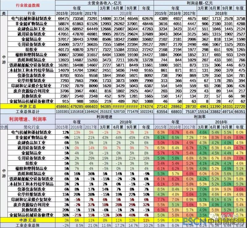 2018年中游行業(yè)的銷售收入增長(zhǎng)11%,收入增長(zhǎng)較慢,但利潤(rùn)增長(zhǎng)11%。中游行業(yè)銷售利潤(rùn)率達(dá)到6.1%,較2017年的銷售利潤(rùn)率6.2%下降了0.1個(gè)百分點(diǎn),。2018年1-12月份的主要的中游行業(yè)的銷售利潤(rùn)也有所下降,尤其非金屬制品業(yè)業(yè)表現(xiàn)突出。電氣機(jī)械和器材制造業(yè)和通用設(shè)備制造業(yè)到收入較快增長(zhǎng),但利潤(rùn)下行較大,紡織業(yè)和橡膠、船舶等行業(yè)利潤(rùn)增長(zhǎng)是銷售增長(zhǎng)利潤(rùn)率4季度改善。