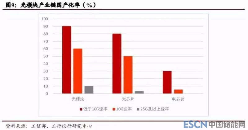5G的部署將從兩方面帶動光模塊產(chǎn)業(yè):一方面是宏基站的增加和小基站的大規(guī)模部署帶來網(wǎng)絡(luò)節(jié)點密集化,預(yù)計5G基站數(shù)量是4G的1.5-3倍,基站數(shù)量的增加直接導(dǎo)致光模塊需求大增。另一方面是5G承載網(wǎng)的架構(gòu)變化帶來的設(shè)備更新?lián)Q代也提升了光模塊需求的數(shù)量和性能,未來5G承載網(wǎng)流量大幅增加的情況下,前傳網(wǎng)絡(luò)和回傳網(wǎng)絡(luò)都需要高速化,從現(xiàn)有的25G光模塊逐步升級至100G、甚至400G高速光模塊。目前我國在高速光模塊領(lǐng)域較弱,低于10Gb/s的光模塊國產(chǎn)化率達到90%,10Gb/s的中速光模塊國產(chǎn)化率達到60%,而25Gb/s以上的高速光模塊國產(chǎn)化率僅不到10%,目前高速光模塊產(chǎn)品幾乎全部由美國、日本廠商主導(dǎo)。我國在封裝代工領(lǐng)域較為成熟,主要依賴低廉人工成本和進入門檻較低的中低端產(chǎn)品參與市場競爭,但整體產(chǎn)品附加值不高、同質(zhì)化嚴重。