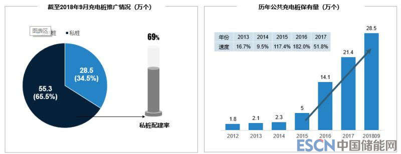 目前制約電動汽車普及一個非常大的障礙就是充電問題,從充電聯(lián)盟了解到的數(shù)據(jù),充電模式的市場規(guī)模在快速發(fā)展,截至2018年9月,全國已累計推廣充電樁83.8萬個,其中公共樁28.9萬個,私充電樁55.3萬個,私充電樁配建率達到69%。