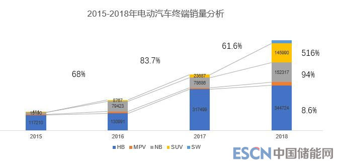 下圖是2015年到2018年,電動汽車的終端銷量組成,向上的趨勢是一目了然的。
