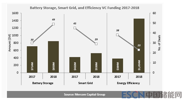 中國(guó)儲(chǔ)能網(wǎng)訊:根據(jù)馬克姆資本集團(tuán)(Mercom Capital Group)的調(diào)查,美國(guó)電池儲(chǔ)能、智能電網(wǎng)和能源效率領(lǐng)域的企業(yè)在2018年共獲得28億美元的投資,比2017年增長(zhǎng)了87%。