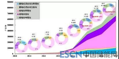 2011年到2017年間,中國(guó)新能源汽車(chē)的年產(chǎn)量從不足5千輛發(fā)展到80萬(wàn)輛,保有量從1萬(wàn)輛提升到180萬(wàn)輛,均占全球的50%以上,處于領(lǐng)先地位,如圖9所示。2018年產(chǎn)量超過(guò)了100萬(wàn)輛。這是中國(guó)首次在全球率先成功大規(guī)模導(dǎo)入高科技民用大宗消費(fèi)品。2017年國(guó)際著名咨詢公司羅蘭貝格發(fā)布第三方評(píng)價(jià):從市場(chǎng)、行業(yè)、技術(shù)三個(gè)方面來(lái)看,中國(guó)新能源汽車(chē)總體發(fā)展指數(shù)排名全球第一。2018年,習(xí)近平總書(shū)記在兩院院士大會(huì)上指出:在著力引領(lǐng)產(chǎn)業(yè)向中高端邁進(jìn)方面,新能源汽車(chē)與第三代核電“華龍一號(hào)”、掘進(jìn)裝備等躋身世界前列。