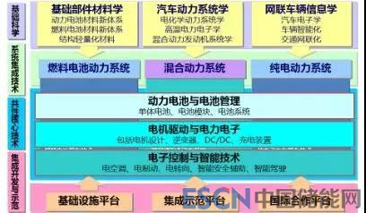 “十五”是我國(guó)新能源汽車(chē)打基礎(chǔ)的階段?!笆濉薄峨妱?dòng)汽車(chē)》重大科技專項(xiàng)確立了“三縱三橫”矩陣式技術(shù)研發(fā)體系(“三縱”:燃料電池汽車(chē)、混合動(dòng)力汽車(chē)、純電動(dòng)汽車(chē);“三橫”:電池、電機(jī)和電控),如圖5所示。