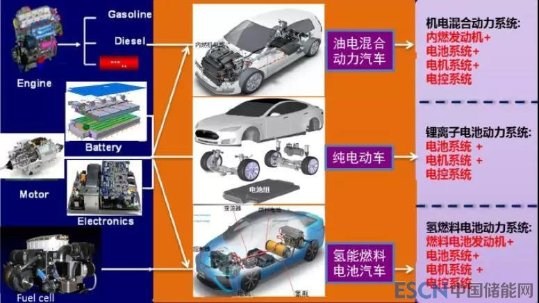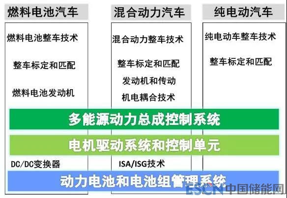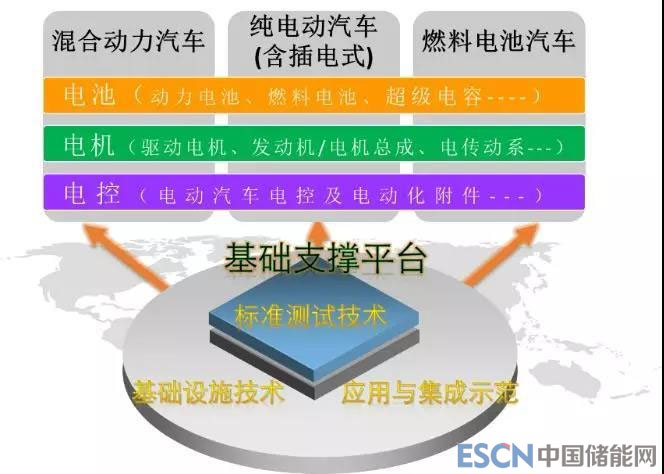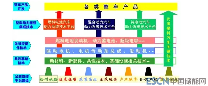 以上三條技術(shù)路線中,純電動(dòng)汽車(chē)動(dòng)力系統(tǒng)相對(duì)是比較簡(jiǎn)單的,混合動(dòng)力系統(tǒng)更為復(fù)雜一些,燃料電池動(dòng)力系統(tǒng)最為復(fù)雜。盡管其有很大差別,但這些動(dòng)力系統(tǒng)具有共性核心技術(shù),包括發(fā)動(dòng)機(jī)、動(dòng)力電池、電機(jī)驅(qū)動(dòng)、和燃料電池發(fā)動(dòng)機(jī)等,如圖4所示。因此,新能源汽車(chē)國(guó)家研發(fā)的核心目標(biāo)就是建立新能源動(dòng)力系統(tǒng)共性核心技術(shù)平臺(tái),為企業(yè)開(kāi)發(fā)各類產(chǎn)品提供技術(shù)支撐。