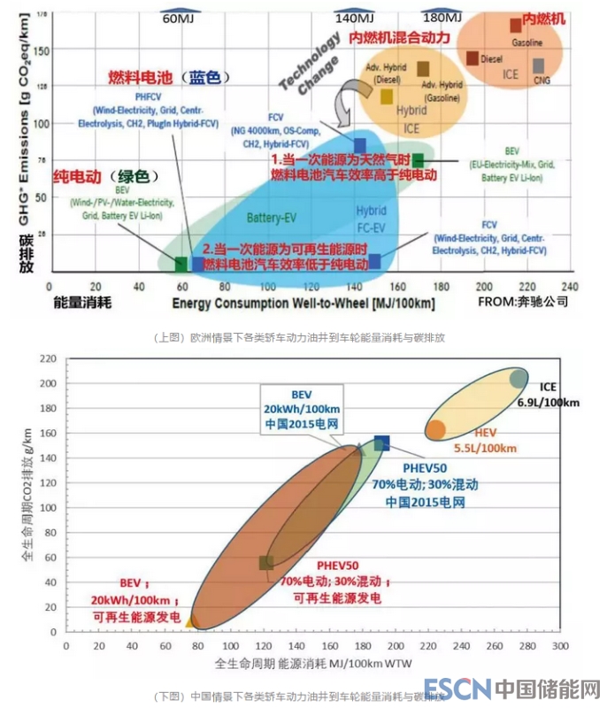 第一條技術(shù)路徑是液體燃料發(fā)展路線。發(fā)展先進(jìn)內(nèi)燃機(jī)技術(shù),從而發(fā)展混合動(dòng)力和可外接充電的混合動(dòng)力;第二條技術(shù)路徑是氣體燃料發(fā)展路線。從天然氣內(nèi)燃機(jī)技術(shù)到燃料電池發(fā)動(dòng)機(jī),從燃?xì)饣旌蟿?dòng)力發(fā)展到氫能燃料電池汽車(chē);第三條技術(shù)路線是電能源技術(shù)路線。發(fā)展電池/電機(jī)驅(qū)動(dòng)系統(tǒng),從而發(fā)展包括增程式在內(nèi)的融合可再生能源發(fā)電的純電動(dòng)汽車(chē)。三條技術(shù)路線的能耗與排放比較(以家用中級(jí)轎車(chē)為例)見(jiàn)圖3,從中可以看出:從碳排放和能源消耗的角度看,純電動(dòng)和燃料電池技術(shù)路線明顯優(yōu)于內(nèi)燃機(jī)和常規(guī)混合動(dòng)力技術(shù)路線。而燃料電池和純電動(dòng)技術(shù)路線的比較則取決于一次能源的來(lái)源。當(dāng)一次能源為天然氣時(shí),燃料電池汽車(chē)效率高于純電動(dòng)汽車(chē),而當(dāng)一次能源為可再生能源時(shí),純電動(dòng)的效率顯著優(yōu)于燃料電池汽車(chē)。而且,燃料電池汽車(chē)和純電動(dòng)汽車(chē)的碳排放也大大低于內(nèi)燃機(jī)汽車(chē)和常規(guī)混合動(dòng)力汽車(chē)。只有基于可再生能源,才能實(shí)現(xiàn)近零碳排放。