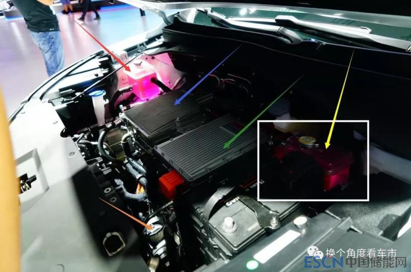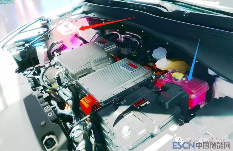 對圖片進行技術處理后,可以更清晰的看到江淮iEVS4適配的2組散熱管路補液壺狀態(tài)。電驅(qū)動(驅(qū)動電機+電機控制總成+快充機+高壓配電總成)循環(huán)管路補液壺(紅色箭頭)與液態(tài)動力電池熱管理循環(huán)管路補液壺(藍色箭頭)的壓力將會保持相當(具體數(shù)值不能最終確認)。