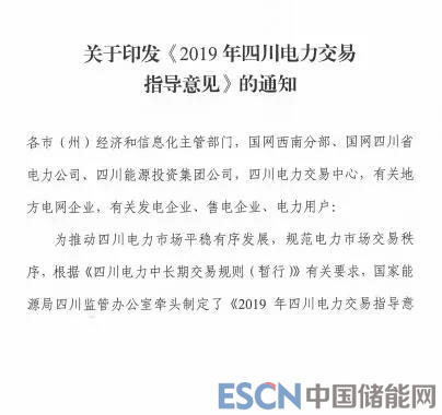 中國儲能網(wǎng)訊:近日,四川能監(jiān)辦、四川省經(jīng)信廳聯(lián)合發(fā)布關(guān)于印發(fā)《2019年四川電力交易指導意見》(以下簡稱《意見》)通知。