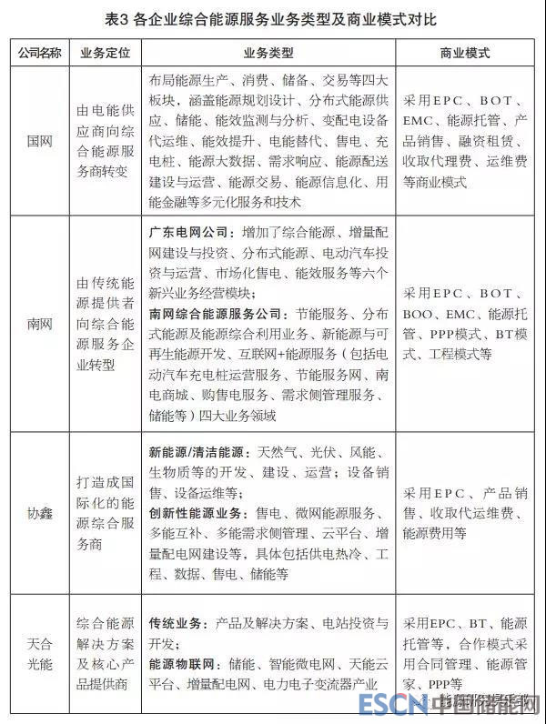 就企業(yè)對綜合能源服務業(yè)務的定位而言,國網、南網、協(xié)鑫都致力于向綜合能源服務商轉型,而天合光能致力于做提供綜合能源解決方案的服務商。就業(yè)務類型而言,由于園區(qū)、工業(yè)、大型公共建筑等對象承擔的能源價格較高、能源需求巨大、用能形式豐富,能夠取得較好的經濟、環(huán)境、社會效益,目前,綜合能源服務企業(yè)一致將重點放在這三類服務對象上,統(tǒng)籌運用能效診斷、節(jié)能改造、用能監(jiān)測、分布式新能源發(fā)電、冷熱電三聯(lián)供、儲能等多種技術,積極推進綜合能源服務業(yè)務。因此,其業(yè)務類型大致相近,且商業(yè)模式創(chuàng)新不足,均在積極探索中。見表3。