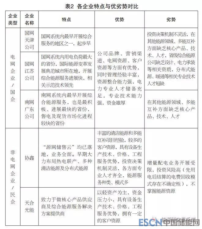 選取的調研企業(yè)既包括國企、民營企業(yè),又包括電網企業(yè)與非電網企業(yè),所在地區(qū)與企業(yè)特點比較鮮明。各企業(yè)在向綜合能源服務轉型中都具有各自明顯的優(yōu)勢,但同時也存在一定的短板,見表2。
