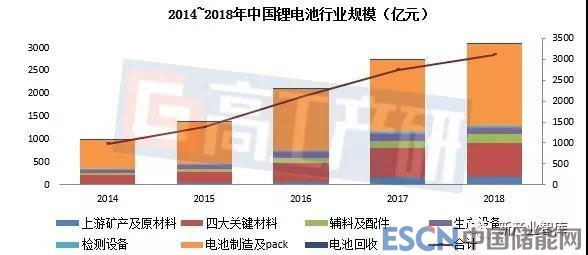 高工產(chǎn)研鋰電研究所(GGII)調研顯示,2018年中國鋰電產(chǎn)業(yè)鏈(不含下游應用環(huán)節(jié))市場規(guī)模突破3200億元,較2017年同比增幅超過15%,其中鋰電池規(guī)模為1550億元(數(shù)碼電池主要統(tǒng)計電芯規(guī)模、儲能及動力主要統(tǒng)計模組和pack規(guī)模)。