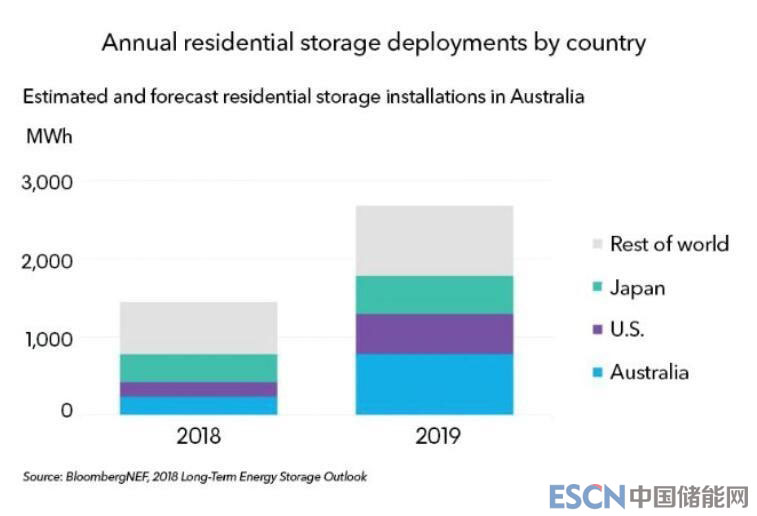 在越來越多的住宅電池補貼計劃被納入州和地區(qū)能源政策的背景下,澳大利亞正在成為全球最大的儲能市場。根據BNEF發(fā)布的最新預測,澳大利亞的戶用電池數量將在2019年增加三倍。這將使澳大利亞成為世界上最熱門的戶用儲能市場,占全球需求的30%。