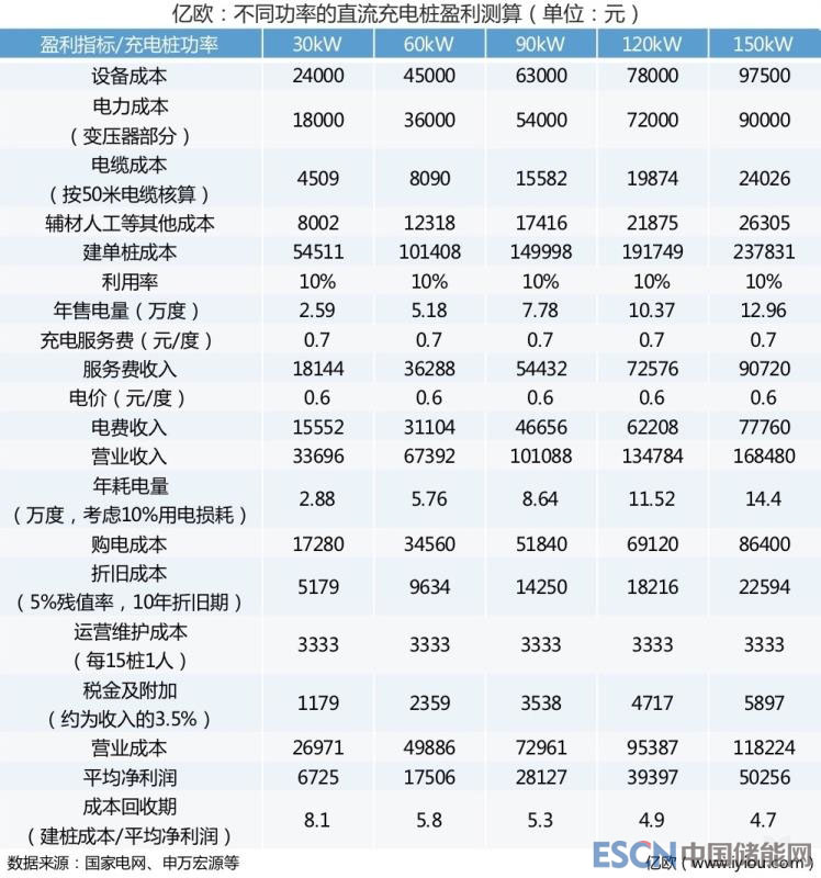 小功率的充電樁不僅充電速度跟不上,盈利周期也很長。據(jù)申萬宏源的測算,30kw的直流充電樁,其成本回收期為8.1年,而150kw的直流充電樁的成本回收期則可縮短至4.7年。(見下表)