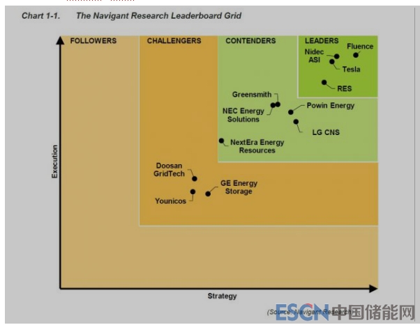 在報告中,Navigant公司根據對公司愿景、市場戰(zhàn)略、合作伙伴、生產戰(zhàn)略、技術發(fā)展、地理范圍、銷售、營銷和分銷、產品性能、產品質量和可靠性、產品組合、定價和持久力的分析對儲能系統(tǒng)集成商進行了評估。