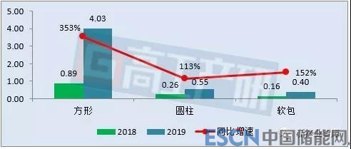 從不同電池形狀來看,2019年1月方形電池裝機電量約4.03GWh,同比增長353%;軟包電池裝機電量約0.40GWh,同比增長152%;圓柱電池裝機電量約0.55GWh,同比增長113%。