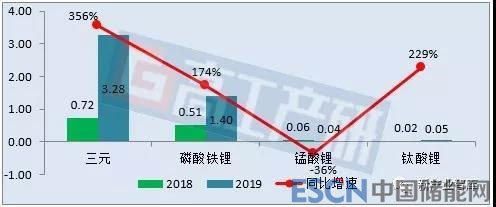 從不同電池類型來看,2019年1月磷酸鐵鋰電池裝機電量約1.40GWh,同比增長174%;三元電池裝機電量約3.28GWh,同比增長356%;錳酸鋰電池裝機電量約0.04GWh,同比下降36%;鈦酸鋰電池裝機電量約0.05GWh,同比增長229%。