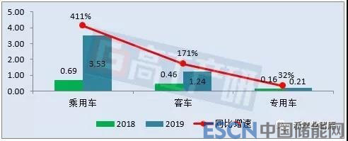 從車輛細分類別來看,2019年1月新能源乘用車電池裝機電量約3.53GWh,同比增長411%;客車電池裝機電量約1.24 GWh,同比增長171%;專用車電池裝機電量約0.21GWh,同比增長32%。