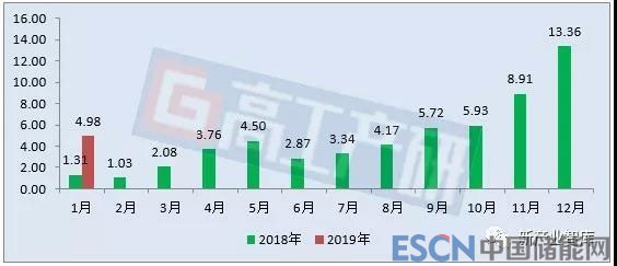 高工產(chǎn)業(yè)研究院(GGII)通過最新發(fā)布的《動力電池字段數(shù)據(jù)庫》統(tǒng)計顯示,2019年1月動力電池裝機總電量約4.98GWh,同比增長281%,新年首月迎來高增長。