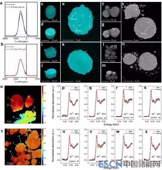 圖6. 循環(huán)前后的7Li MAS NMR光譜:(a)NCM,(b)LT1。透射X射線顯微鏡(TXM)圖像對比:(c-e)循環(huán)前NCM;(f-h)1 C循環(huán)200圈后NCM;(i-k)循環(huán)前LT1;(l-n)1 C循環(huán)200圈后LT1。2D-FF-TXM-XANES 分析:(o-s)1 C循環(huán)200圈后NCM;(t-x)1 C循環(huán)200圈后LT1。