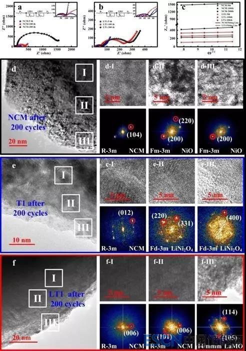 圖5.(a)NCM的阻抗圖;(b)LT1的阻抗圖;(c)Z’re與ω-1/2 的關(guān)系圖。1 C循環(huán)200圈后的HRTEM及相應(yīng)的FFT圖:(d)NCM;(e)T1;(f)LT1。