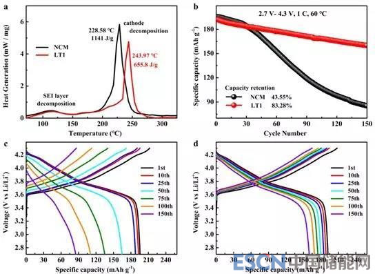 圖4.(a)NCM,LT1充電態(tài)4.3 V下的差示掃描量熱曲線;(b)NCM,LT1在2.7-4.3 V電壓區(qū)間的高溫(60 ℃)循環(huán)性能;(c)NCM在1 C電流密度下的充放電曲線;(d)LT1在1 C電流密度下的充放電曲線。