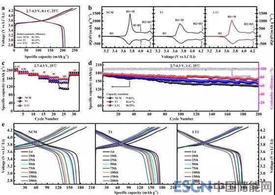 圖3. NCM,T1和LT1在2.7-4.3 V電壓區(qū)間的常溫電化學(xué)性能:(a)首次充放電曲線圖;(b)第一圈的dQ/dV曲線;(c)倍率性能;(d)循環(huán)性能;(e)循環(huán)過程中充放電曲線。