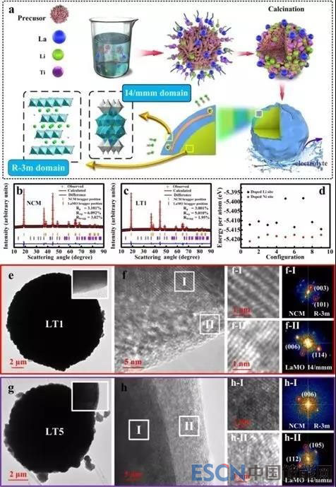 圖2.(a)Ti&LaMO 雙重修飾的合成工藝圖;(b)NCM的結(jié)構(gòu)精修圖;(c)T1的結(jié)構(gòu)精修圖;(d)DFT計(jì)算的Ti在不同取代位點(diǎn)的單原子能量。HRTEM及相應(yīng)的FFT圖:(e,f)LT1;(g,h)LT5。