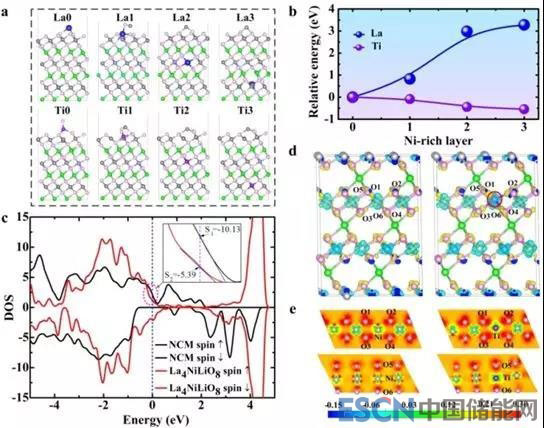 作者們首先采用DFT計(jì)算了Ti與La元素分別占到富鎳材料的表面、1st, 2nd, and 3rd相應(yīng)的遷移勢壘,發(fā)現(xiàn)Ti摻入體相而La逃離至表面的狀態(tài)為體系能量最低的狀態(tài)即穩(wěn)定狀態(tài)。通過DOS計(jì)算分析可知,La4NiLiO8是電子的良導(dǎo)體。Ti-O鍵比Ni-O鍵鍵能大,有利于抑制相轉(zhuǎn)變。