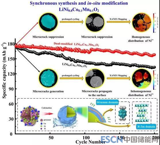 3、TXM和XANES測試表明,LiNi0.8Co0.1Mn0.1O2在循環(huán)過程中存在微裂紋擴(kuò)展,以及二次顆粒結(jié)構(gòu)衰減不一致的現(xiàn)象。雙重修飾成功抑制了LiNi0.8Co0.1Mn0.1O2晶間裂紋的形成和擴(kuò)展,增強(qiáng)了材料結(jié)構(gòu)的穩(wěn)定性和一致性。