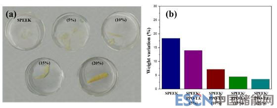 圖6.不同共混比的兩性膜經(jīng)過(guò)40天氧化之后的形貌受損和質(zhì)量損失