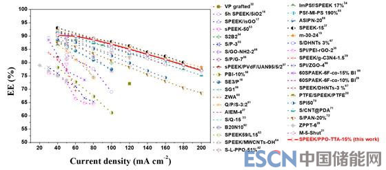 圖4.多叔胺型兩性離子交換膜與近年來(lái)報(bào)道的其余類型兩性膜及SPEEK基質(zhì)膜的電池性能對(duì)比