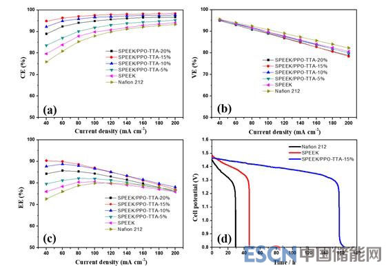 該團(tuán)隊(duì)進(jìn)一步對(duì)所制備的新型兩性離子交換膜的電池性能進(jìn)行了測(cè)試并與常用的Nadion 212和SPEEK膜以及近些年報(bào)道的其余類型的兩性膜和SPEEK基質(zhì)膜進(jìn)行了對(duì)比。研究結(jié)果表明,隨著叔胺基團(tuán)含量的增加,由于基于酸堿對(duì)結(jié)構(gòu)和高效氫鍵網(wǎng)絡(luò)的高性能親水離子通道的建立,所制備的多叔胺型兩性離子交換膜所組裝電池在保持了優(yōu)異的電壓效率(VE)的同時(shí)其庫(kù)倫效率(CE)和能量效率(EE)獲得了顯著提升。在40~200 mA?2電流密度下,共混比為15%的兩性離子交換膜組裝的電池CE和EE分別可達(dá)94.3%~98.3%和90.3%~77.1%,并且經(jīng)過(guò)200次循環(huán)后沒(méi)有明顯降低。其性能遠(yuǎn)優(yōu)于Nafion 212膜以及原始的SPEEK膜,并且在近年來(lái)報(bào)道的兩性膜以及SPEEK基質(zhì)膜中處于很高水平。該工作為離子交換膜傳導(dǎo)率和選擇性的平衡以及其高性能親水離子通道的設(shè)計(jì)提供了新的策略。