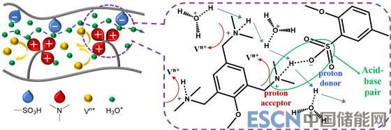其傳導(dǎo)機(jī)理如下圖所示,該團(tuán)隊(duì)利用叔胺基團(tuán)作為質(zhì)子受體,與作為質(zhì)子供體的磺酸基團(tuán)形成“酸堿對(duì)”結(jié)構(gòu)?!八釅A對(duì)”的氫鍵交聯(lián)網(wǎng)絡(luò)結(jié)構(gòu)縮小了膜的親水離子通道,有效降低了釩離子的滲透。同時(shí),高效的氫鍵網(wǎng)絡(luò)結(jié)構(gòu)有助于質(zhì)子的傳導(dǎo),保證了其優(yōu)異的質(zhì)子傳導(dǎo)能力。除此之外,未形成“酸堿對(duì)”的叔胺在酸性環(huán)境中可結(jié)合質(zhì)子并帶正電荷,進(jìn)一步促進(jìn)了氫鍵網(wǎng)絡(luò)的構(gòu)建,增強(qiáng)了質(zhì)子的傳導(dǎo),阻礙了釩離子的滲透。
