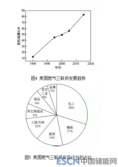 燃?xì)饫錈犭娙?lián)供在國外已有30多年發(fā)展歷史,在美國、日本等國家得到大力發(fā)展和推廣。當(dāng)前,幾乎所有的歐盟國家正在建立適合自身特點(diǎn)的天然氣分布式能源系統(tǒng)以及與之相配套的能源計(jì)劃。美國的燃?xì)饫錈犭娙?lián)供裝機(jī)規(guī)模發(fā)展趨勢(shì)如圖4所示,其在各行業(yè)中的占比情況如圖5所示: