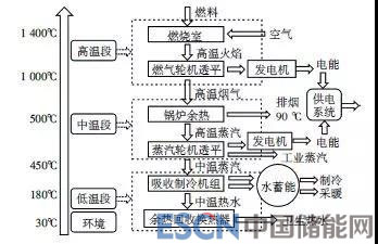 燃?xì)饫錈犭娙?lián)供是指以天然氣為主—燃料帶動(dòng)燃?xì)廨啓C(jī)或內(nèi)燃機(jī)等燃?xì)獍l(fā)電設(shè)備運(yùn)行,產(chǎn)生電力以滿足用戶電力需求,而系統(tǒng)排出的廢熱則通過余熱鍋爐或溴化鋰等設(shè)備向用戶供熱、供冷。三聯(lián)供系統(tǒng)實(shí)現(xiàn)能源的梯級(jí)利用,其能源綜合利用效率高達(dá)80%以上,典型能量梯級(jí)利用如圖1所示: