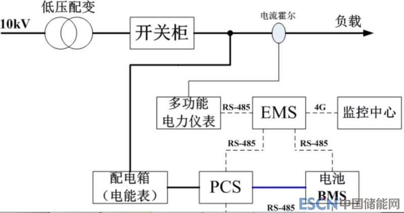 儲能體系容量為100kW/494kWh,由磷酸鐵鋰電池、電池管理系統(tǒng)(BMS)、儲能變流器(PCS)、儲能監(jiān)控柜(EMS)、測控裝置等組成,采納T接方式接入380V配電網(wǎng)。