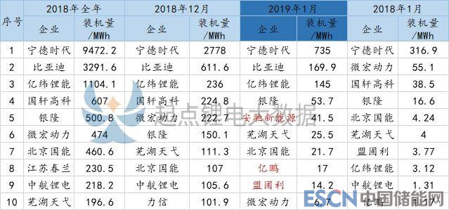 排名前十的動(dòng)力電池企業(yè)分別是寧德時(shí)代、比亞迪、億緯鋰能、銀隆、安馳新能源、蕪湖天弋、北京國能、億鵬、盟固利和微宏動(dòng)力。