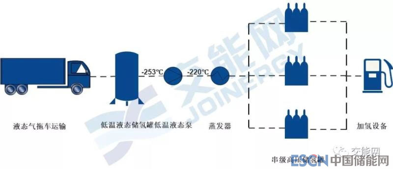 當(dāng)采用氫氣低溫液態(tài)方式運(yùn)輸時(shí),注氫過(guò)程可以采用低溫液態(tài)泵來(lái)代替多級(jí)壓縮機(jī),直接將低溫液態(tài)氫升壓至所需壓力,再通過(guò)蒸發(fā)器,將液氫汽化,注入串級(jí)高壓儲(chǔ)氫罐;這種設(shè)計(jì)的優(yōu)點(diǎn)很多;