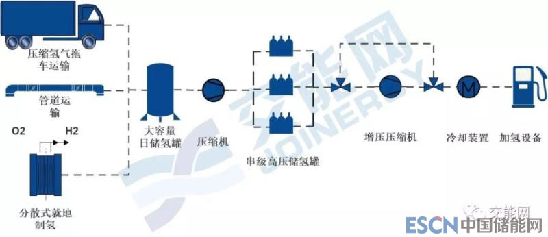 需求主要決定了,加氫站的大小和選址。一般來(lái)說(shuō),對(duì)于氫氣需求量較小的情況,因所需壓縮機(jī)較小,可選擇移動(dòng)式加氫站,用壓縮機(jī)或增壓泵直接將氫氣升壓,加注到燃料電池車(chē)輛,這樣還能使得加氫站脫離地理位置的限制。在氫氣需求量大的情況下,移動(dòng)式加氫站的成本,就相對(duì)較高了,一般都會(huì)選擇固定式加氫站,其主要結(jié)構(gòu)除了中低壓儲(chǔ)氫罐、壓縮機(jī)、加注設(shè)備之外還有高壓串級(jí)儲(chǔ)氫系統(tǒng)。