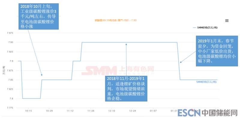 2019年1月末,臨近中國(guó)農(nóng)歷春節(jié),部分中小鋰鹽廠為了資金回籠,愿意降價(jià)出售碳酸鋰,而鋰鹽大廠堅(jiān)持高價(jià)不肯讓步。此時(shí)電池級(jí)碳酸鋰的成交價(jià)格區(qū)間拉大,為7.6-8.1萬元/噸。并自節(jié)前維持至今。