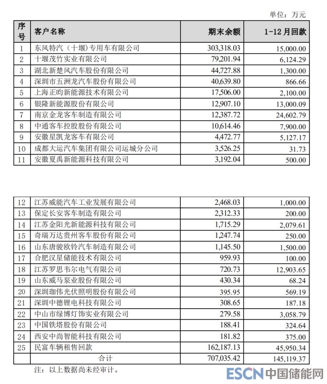 根據(jù)堅(jiān)瑞沃能公布的125.33億元應(yīng)收債權(quán)數(shù)據(jù),其中應(yīng)收賬款占比最高,為89.67億元,不乏來(lái)自東風(fēng)特汽、深圳五洲龍、銀隆新能源、南京金龍、中通客車(chē)等知名企業(yè)(具體數(shù)據(jù)見(jiàn)下圖):
